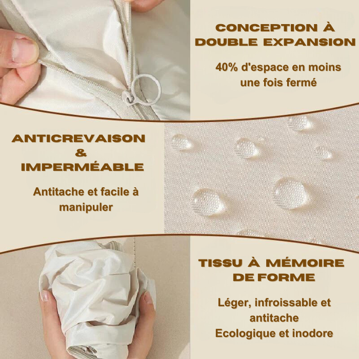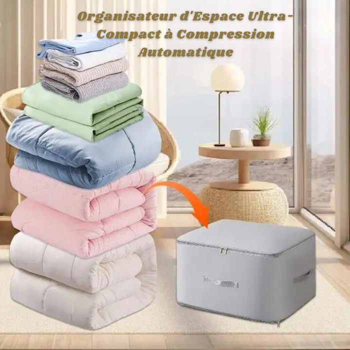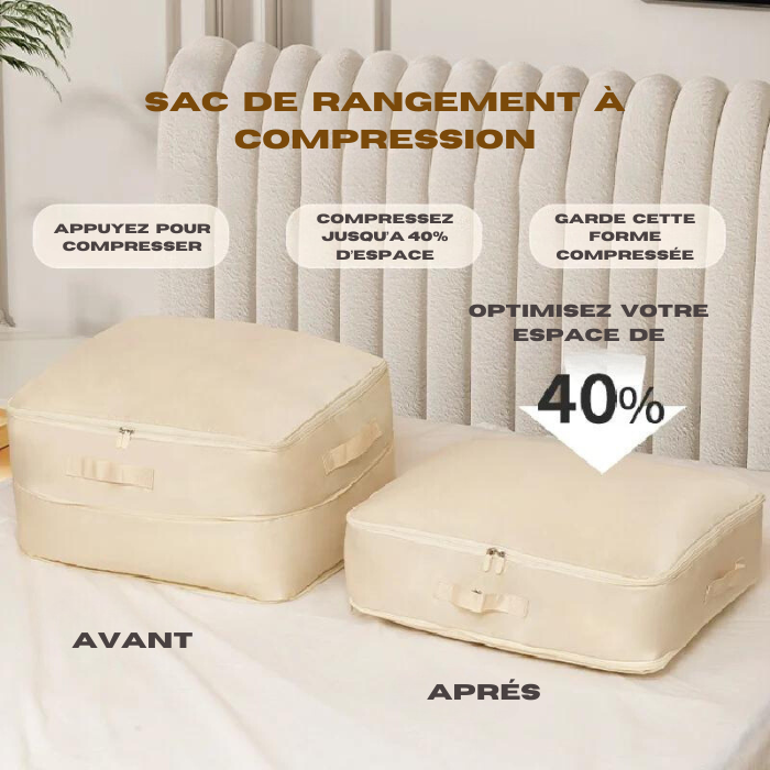 Optimisez votre espace de 40% grâce à nos Sacs de Rangement à Compression. Plus besoin d'aspirateur encombrant ! Zippez et compressez simplement pour créer plus de place pour vos affaires.
